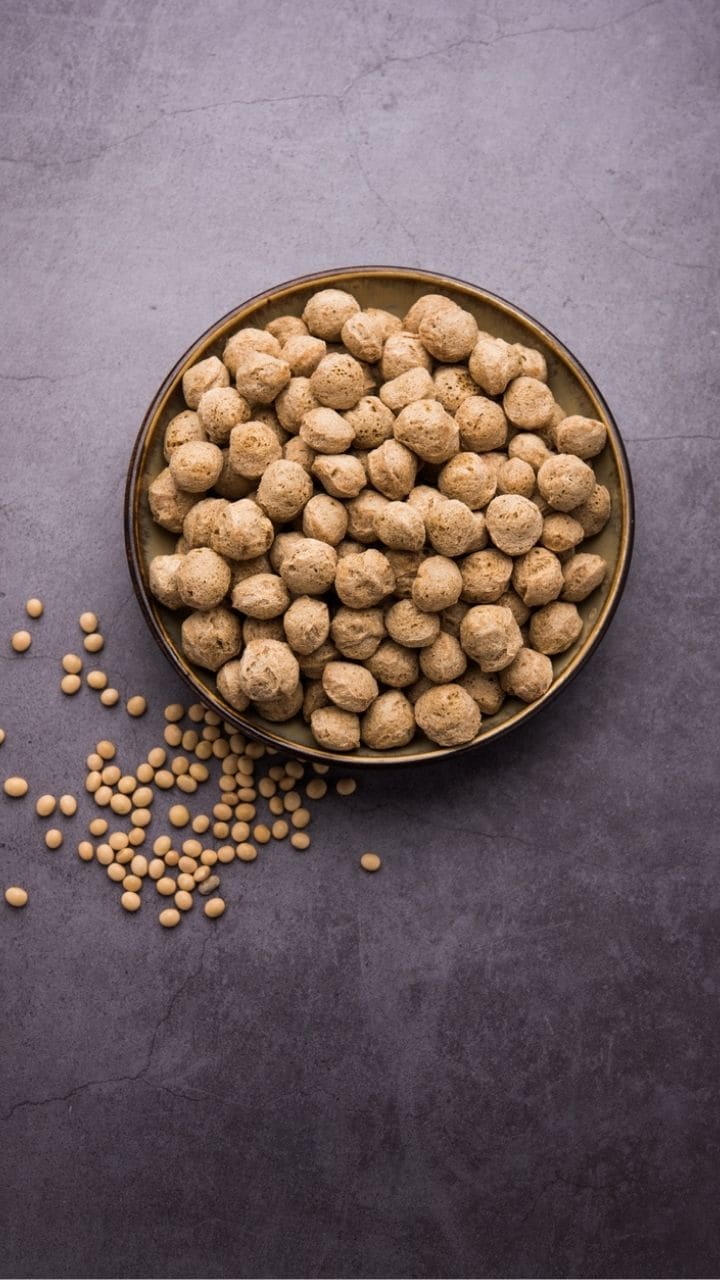 Soya chunks, made from defatted soy flour, are often considered a great source of protein with nine essential amino acids.
