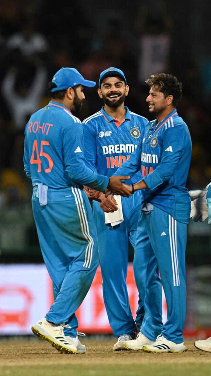 Virat Kohli and Ravindra Jadeja congratulate Hardik Pandya on removing Babar Azam. Photo: AFP/Ishara S Kodikara